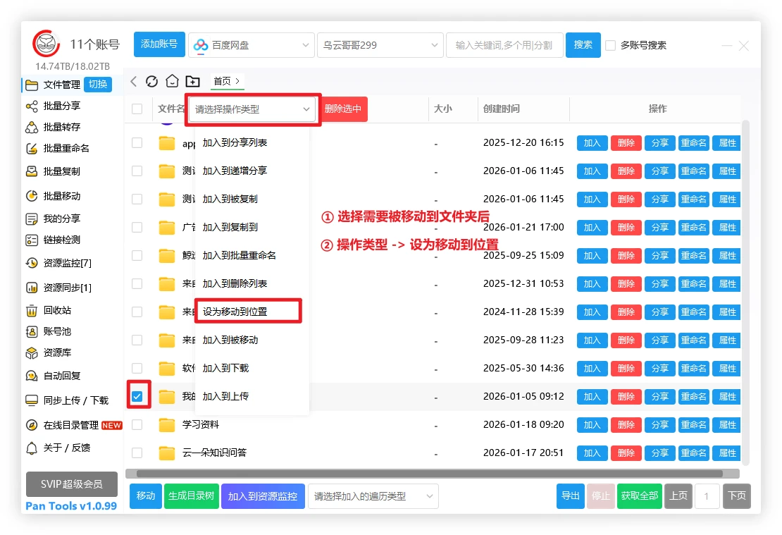 第一步、登陆对应网盘账号,选择 需要移动到的文件夹,操作类型 -> 设为移动到位置