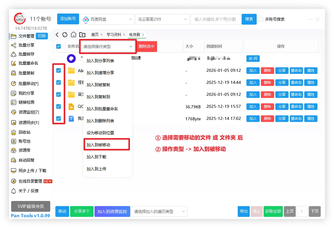 第二步、选择需要移动的文件(夹),选择 操作类型 -> 加入到被移动