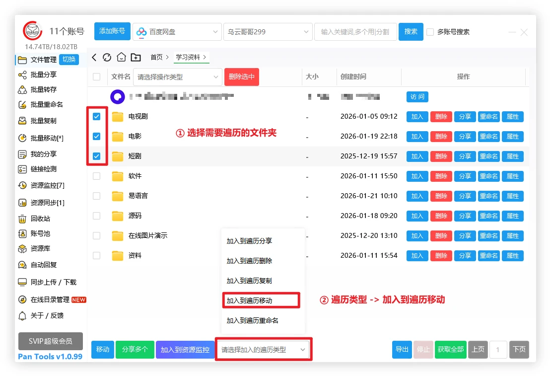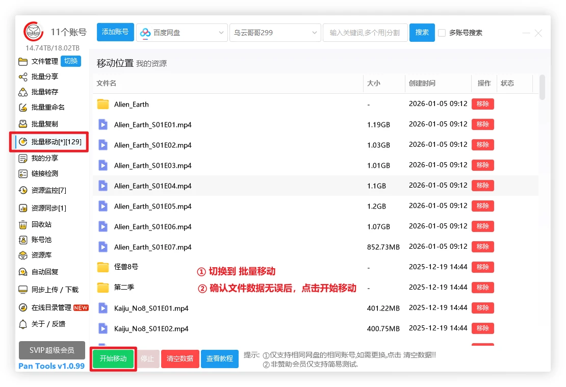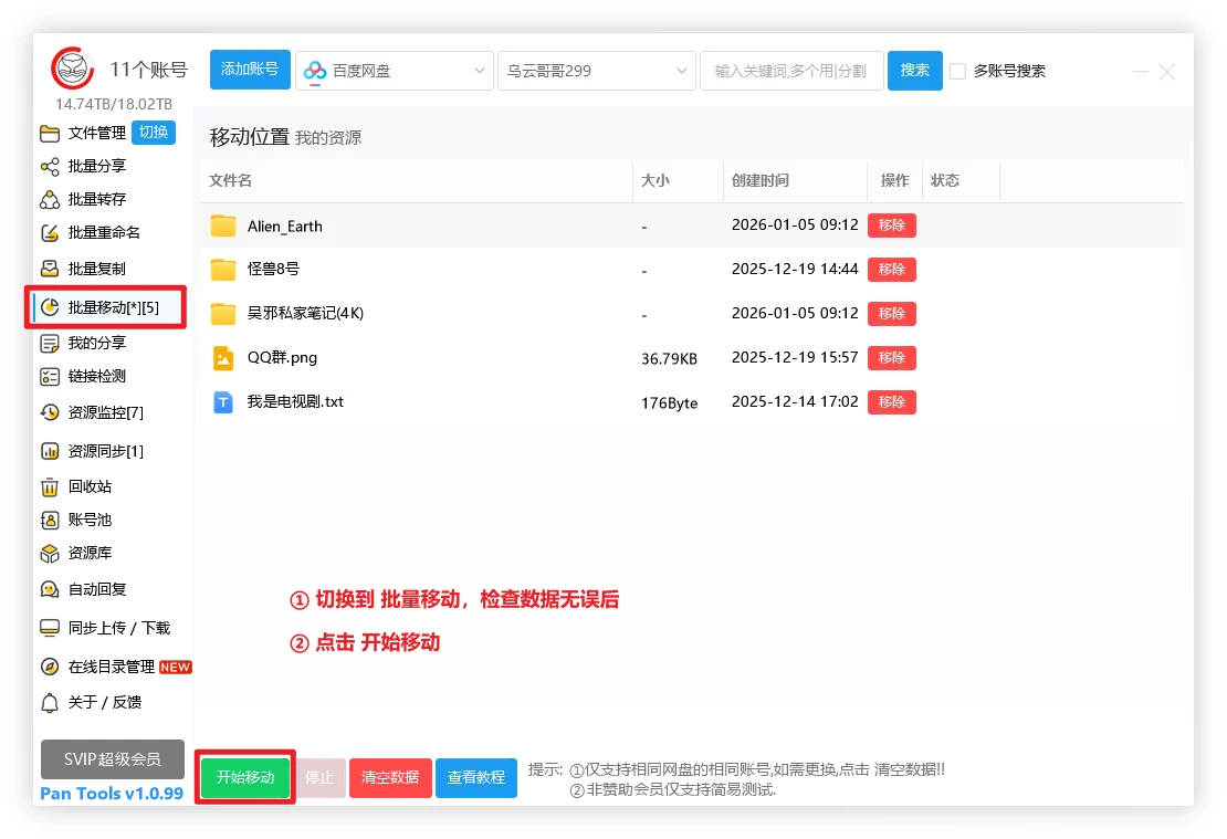 ② 此功能只支持相同网盘的相同账号,不支持跨网盘移动.