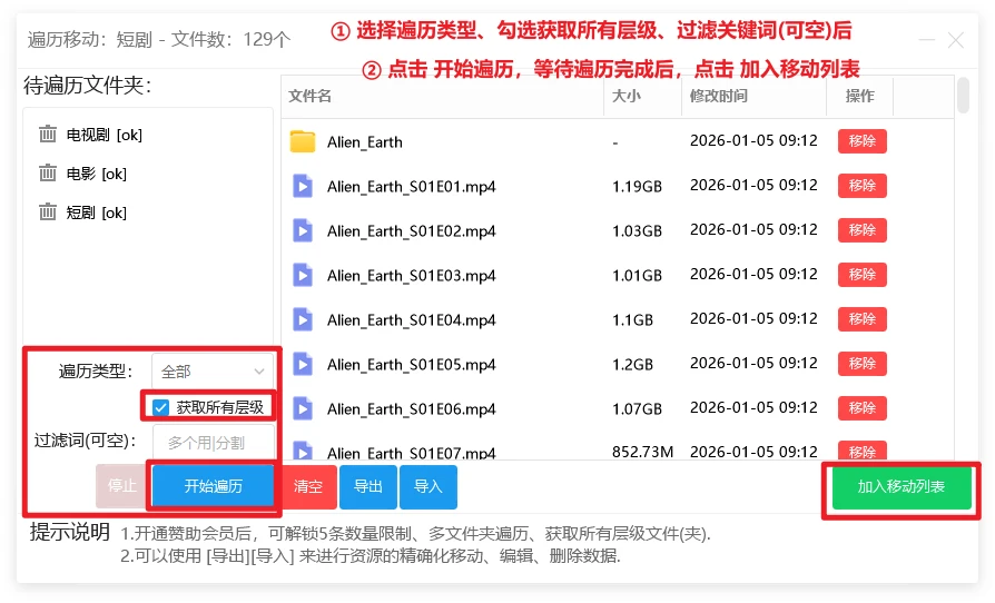 当文件(夹)过多或是位于多层目录时,可使用遍历移动,用于遍历所有的文件(夹),达到快速添加并移动的效果