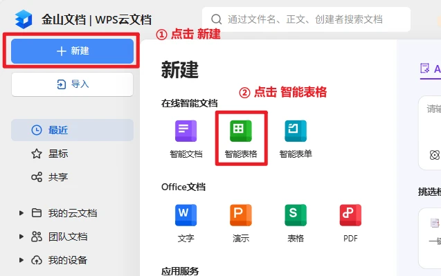 第一步、打开 金山文档,点击 新建,点击 智能表格