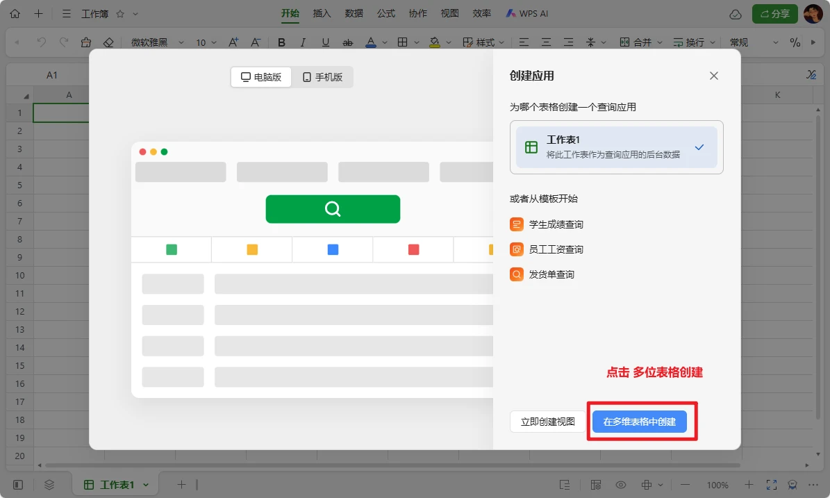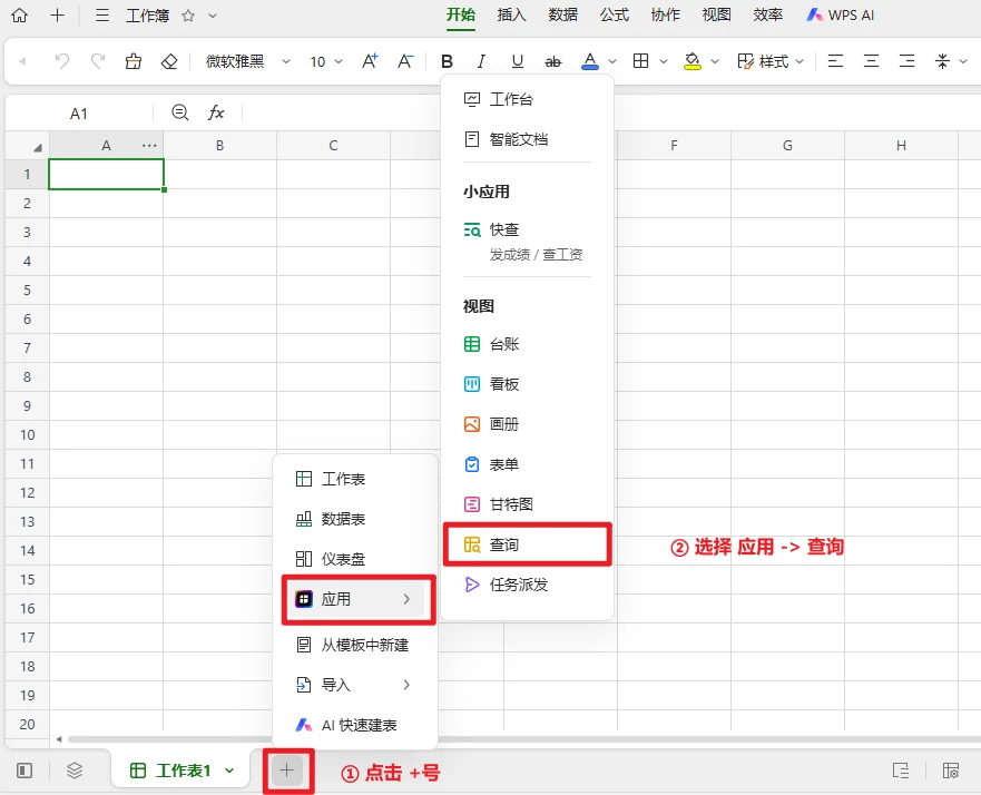第二步、点击 +号,选择 应用 -> 查询 ,点击 在多维表格中创建