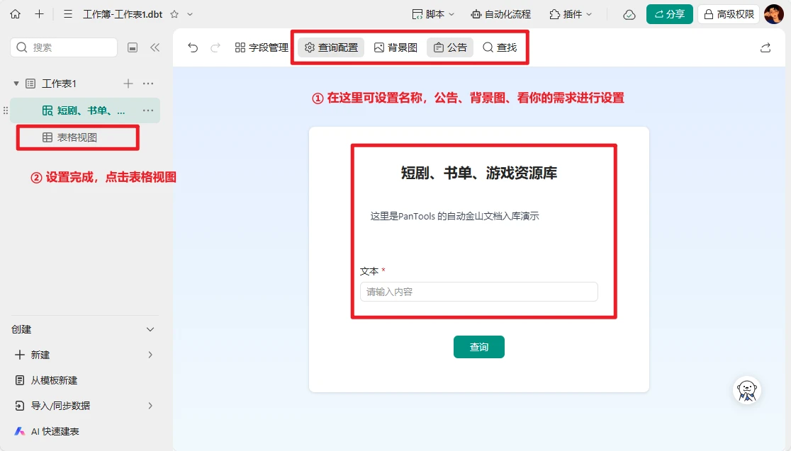 第三步、设置标题、背景图、公告等查询首页设置后,点击 表格视图 设置数据