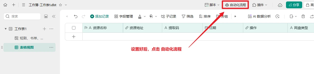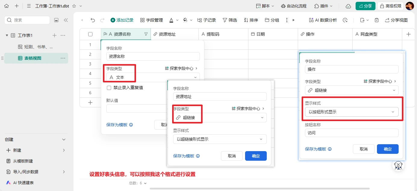 第四步、切换到 表格视图 后,设置表头信息,资源名称、地址、提取码等