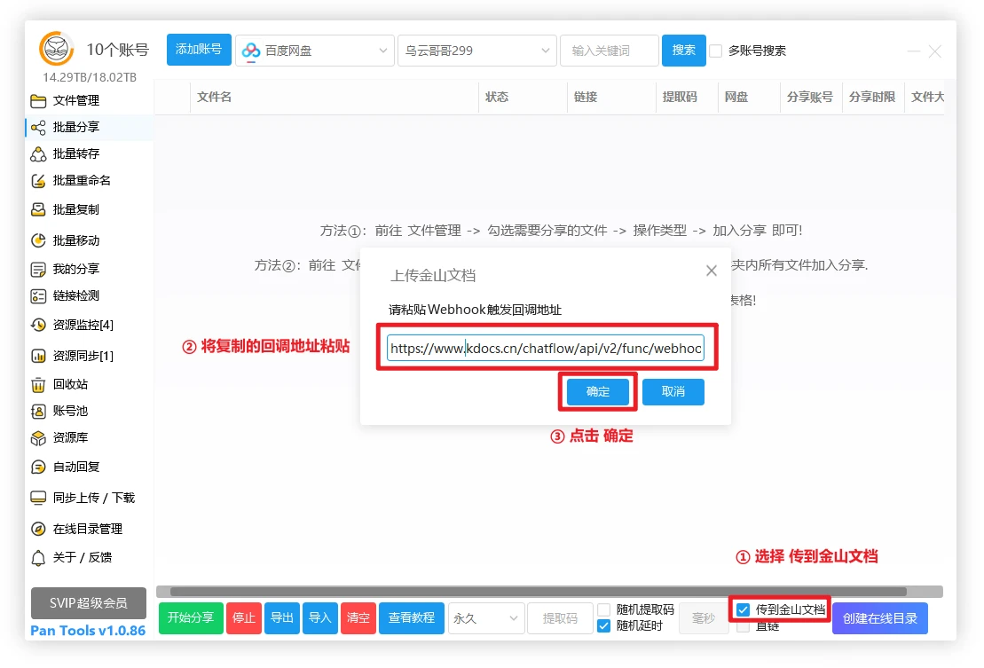 第十一步、自动化流程设置完成后,切换到 PanTools 的批量分享,将 复制的回调地址粘贴