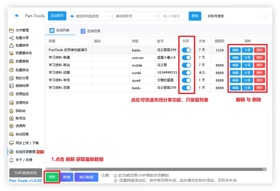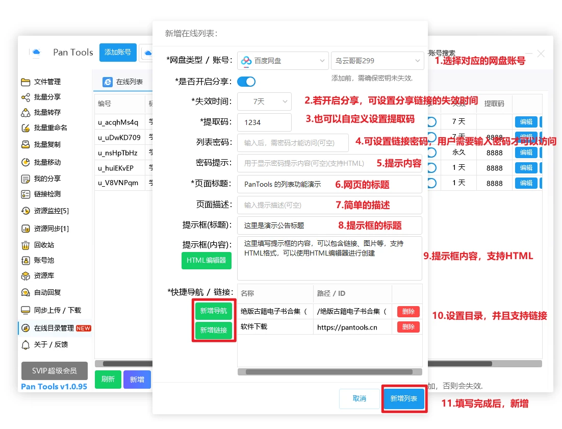 有时候想分享资源给用户,需要去找到对应资源,然后再批量分享,分享后再弄成表格或文档,然后再发给用户,这太麻烦了,PanTools的在线列表功能可以帮你快速处理