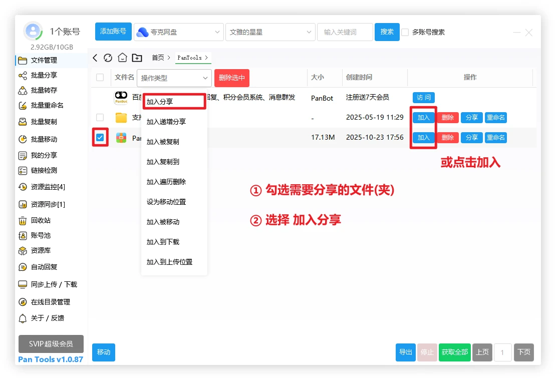 第一步:登录好对应的网盘账号,在 文件管理 处,选中需要分享的文件(夹),上方 操作类型 选择 加入分享。