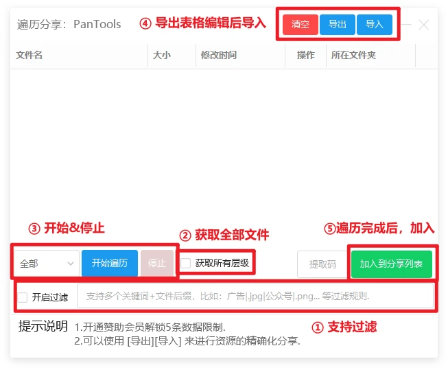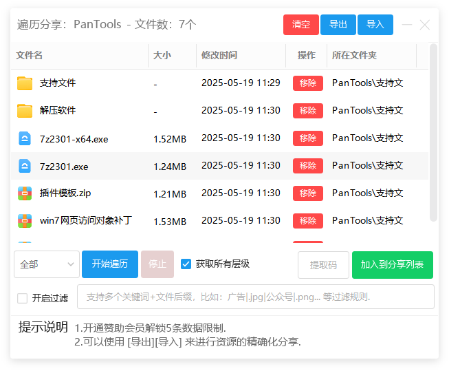 注意:不勾选所有层级的情况下,仅能遍历当前文件夹的文件(夹)