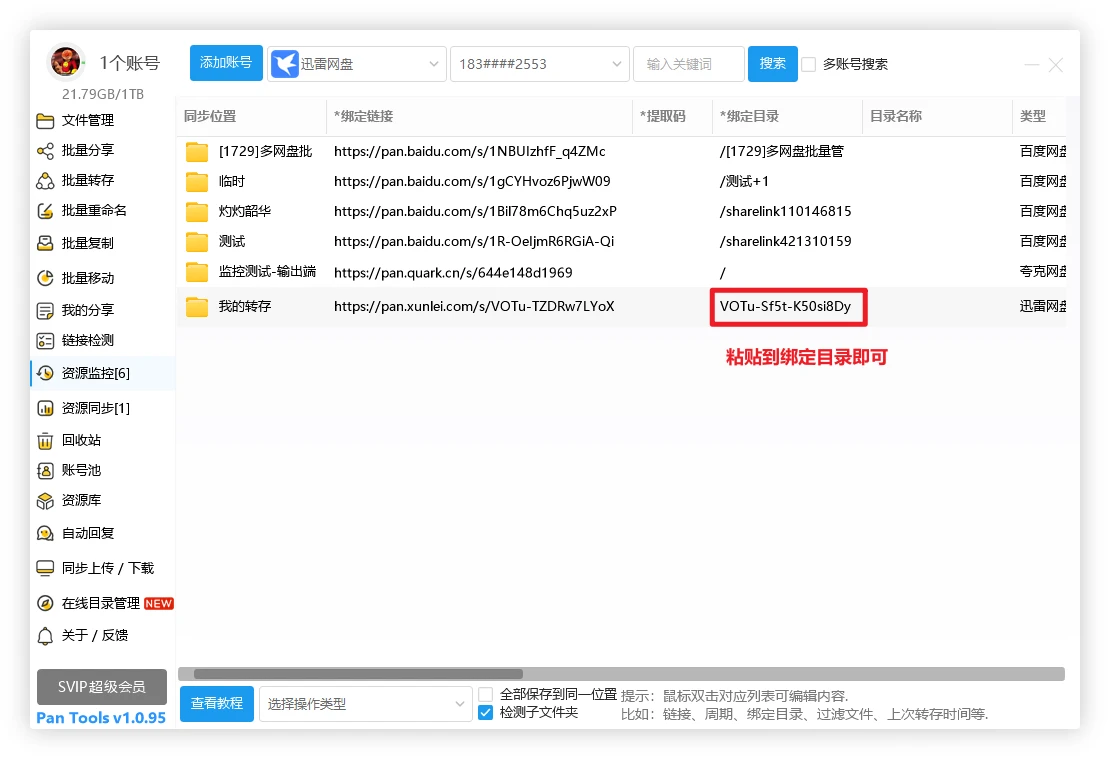 加入后,切换到 资源监控,鼠标双击 绑定链接、提取码、绑定目录等进行填写