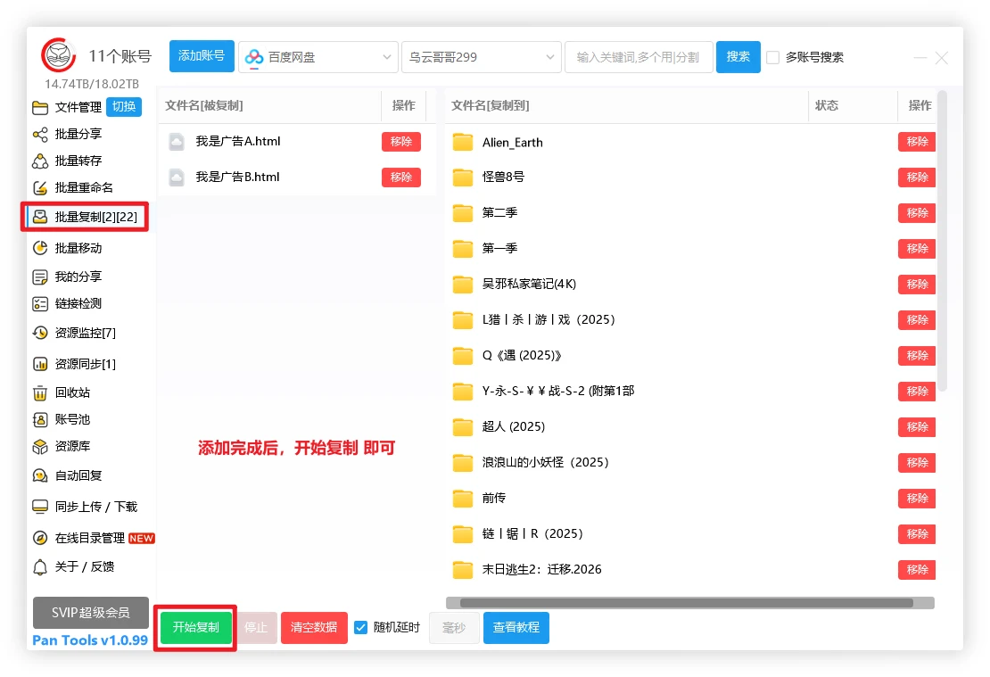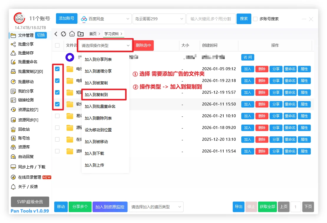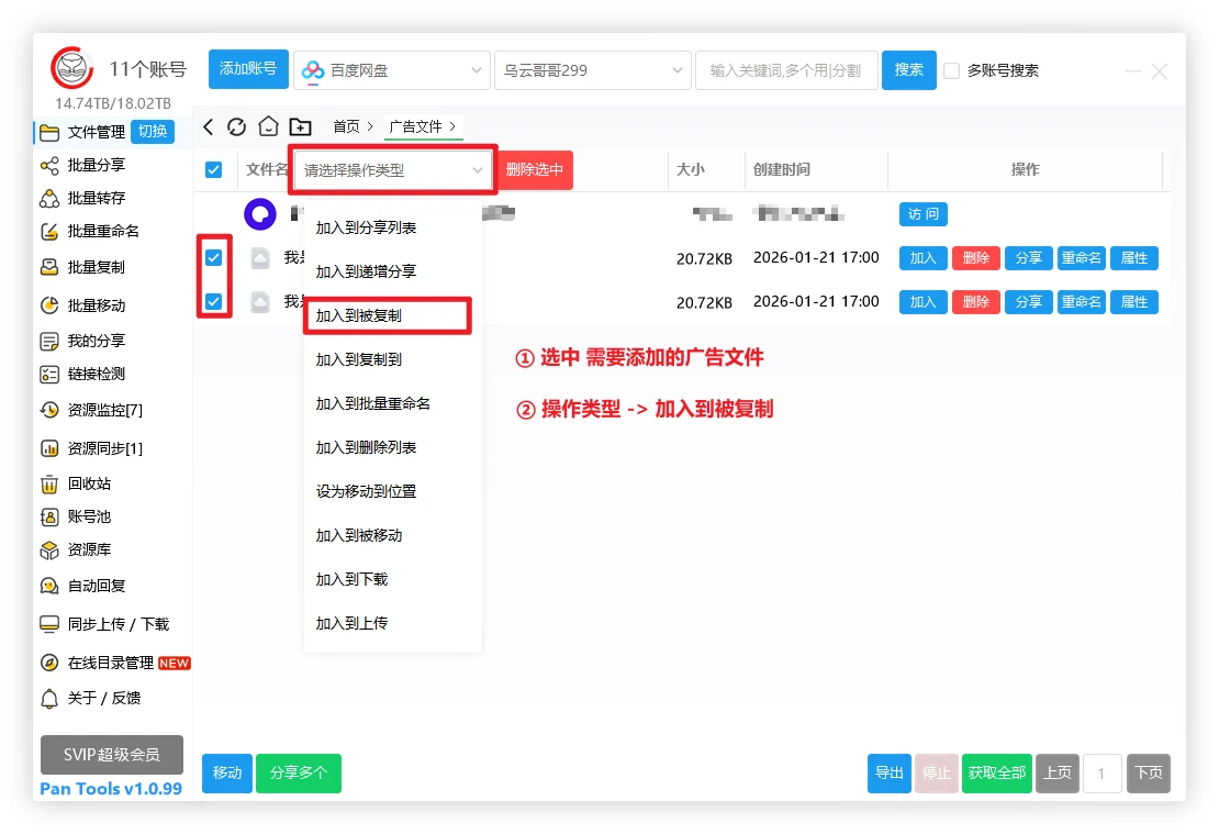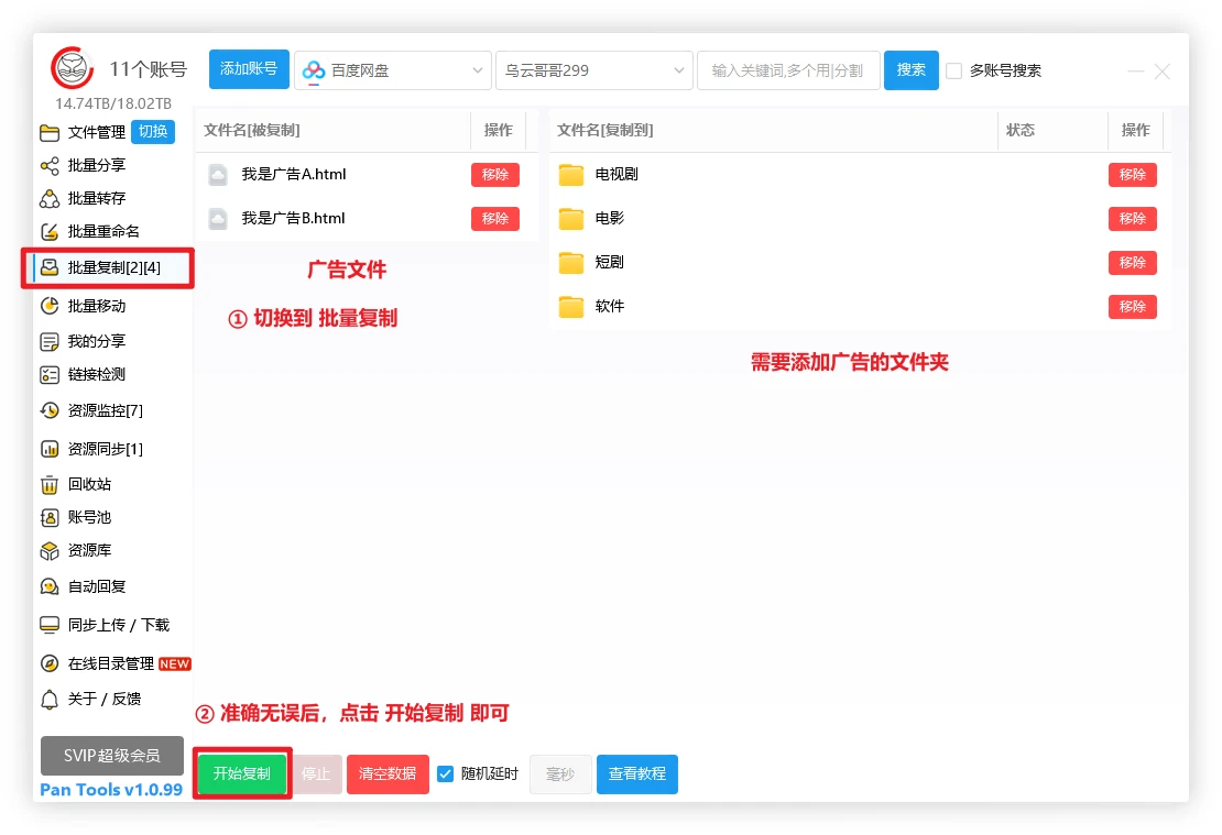 PanTools 如何通过批量复制功能给文件夹内添加广告文件